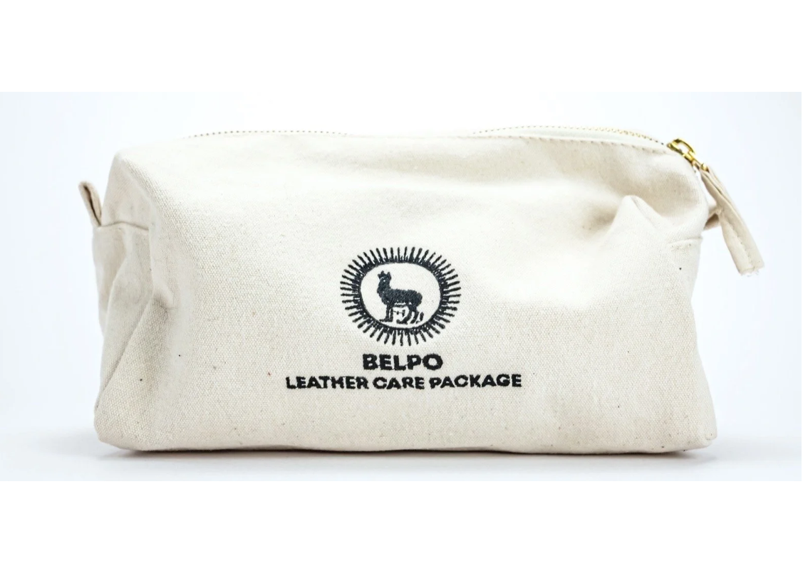Presenting the Belpo Leather Care Package: The Ultimate Gift for Leather Maintenance. This complete set includes Belpolon leather grease (50ml), saddle soap (75ml), liquid saddle soap (250ml), a bristle brush (19cm), and a sponge.