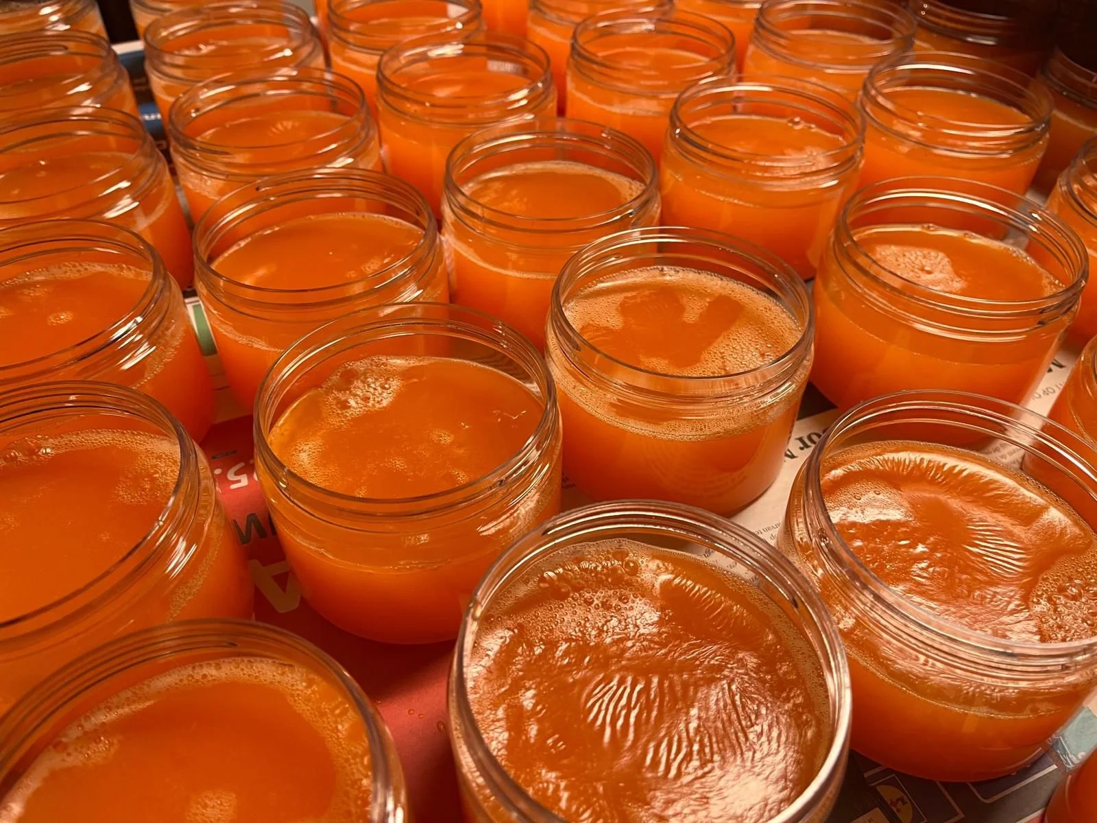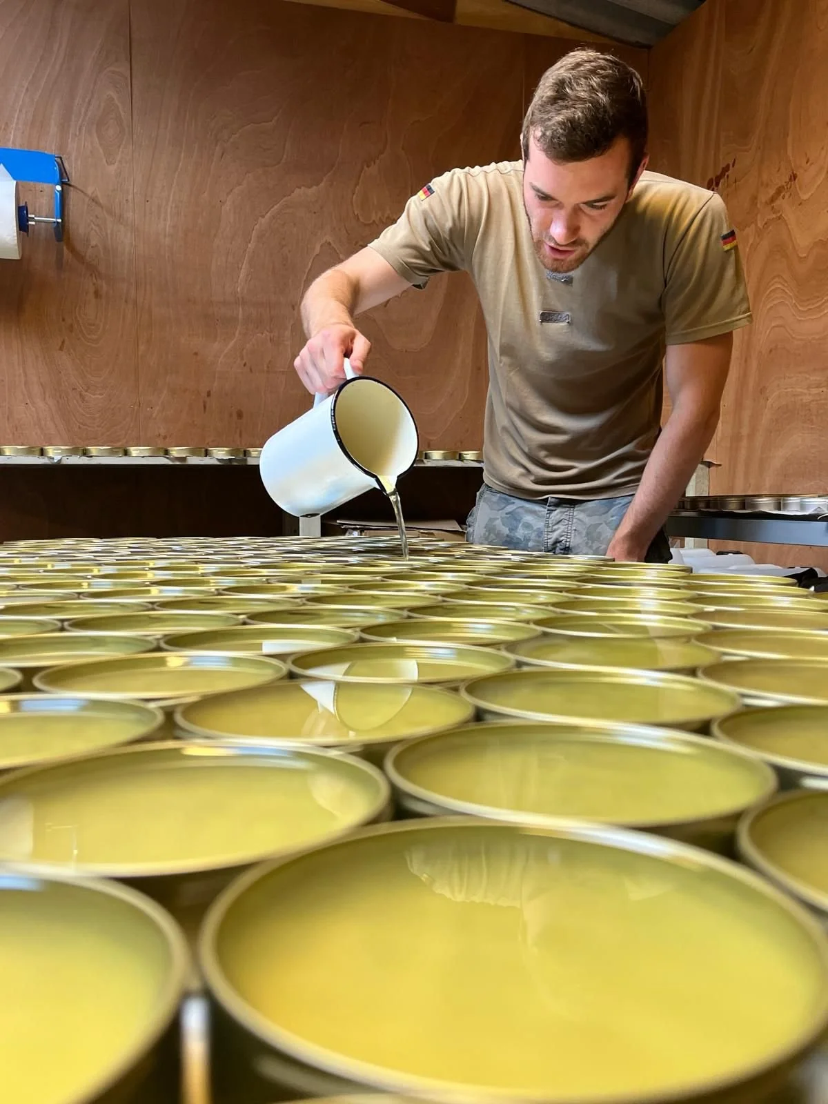 After we've prepared the raw materials, we take the time to hand-fill each container using a pitcher.